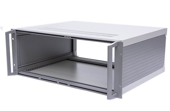 F型機箱由蓋板,底板,前面板,后面板,側板,前梁,后梁,前法蘭,后法蘭等配件組裝而成,為機架式機箱,把手兩側帶有耳朵直接固定的機器內。